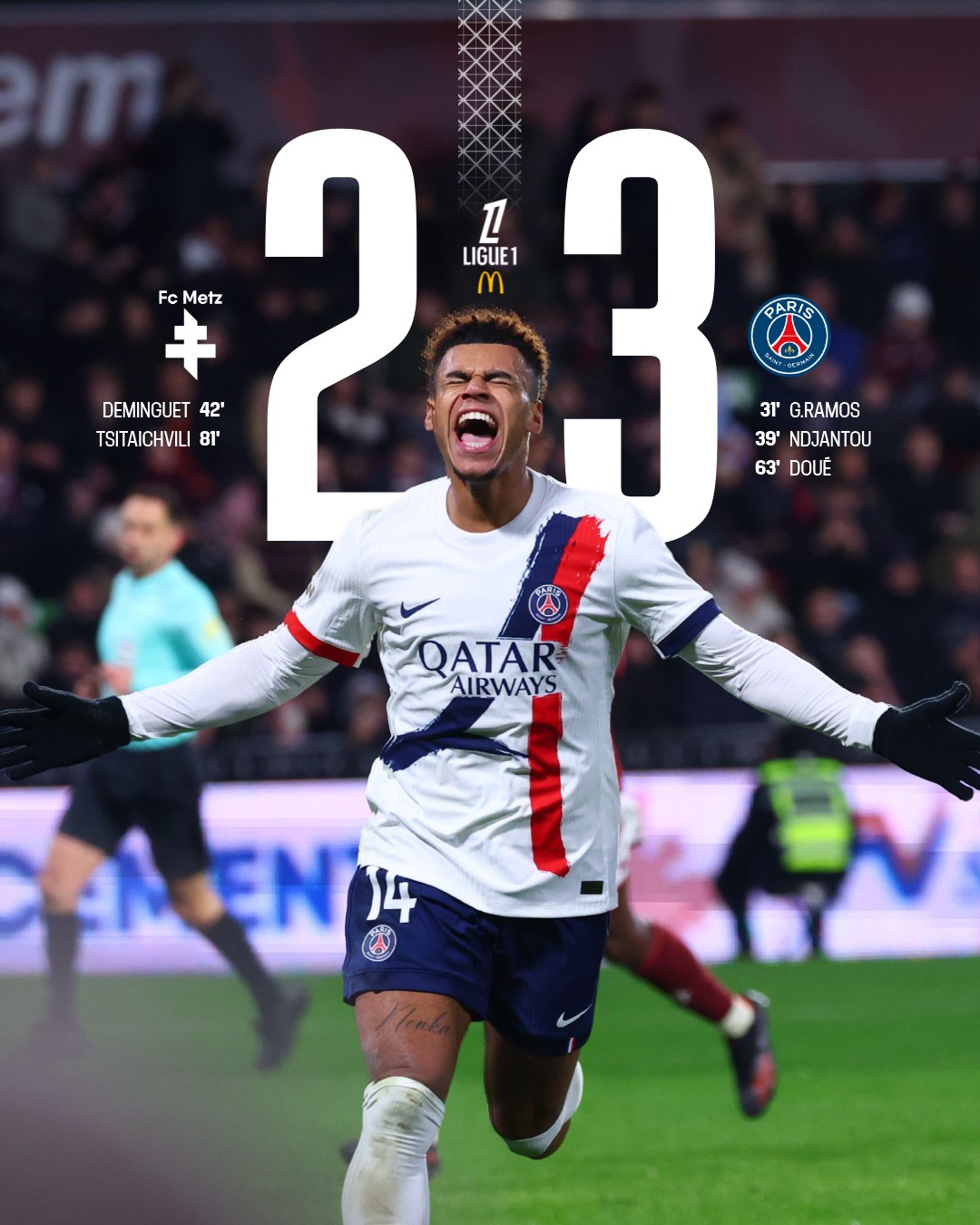 Bàn thắng này cũng giúp dàn sao tấn công PSG cởi bỏ áp lực tâm lí. Phút 39, Mbaye “dọn cỗ” cho Ndjantou nâng tỷ số lên 2-0. Phía đối diện, nỗ lực của Metz cũng giúp đội chủ nhà rút ngắn cách biệt xuống 1-2 ở phút 42 với tình huống lập công của Deminguet..